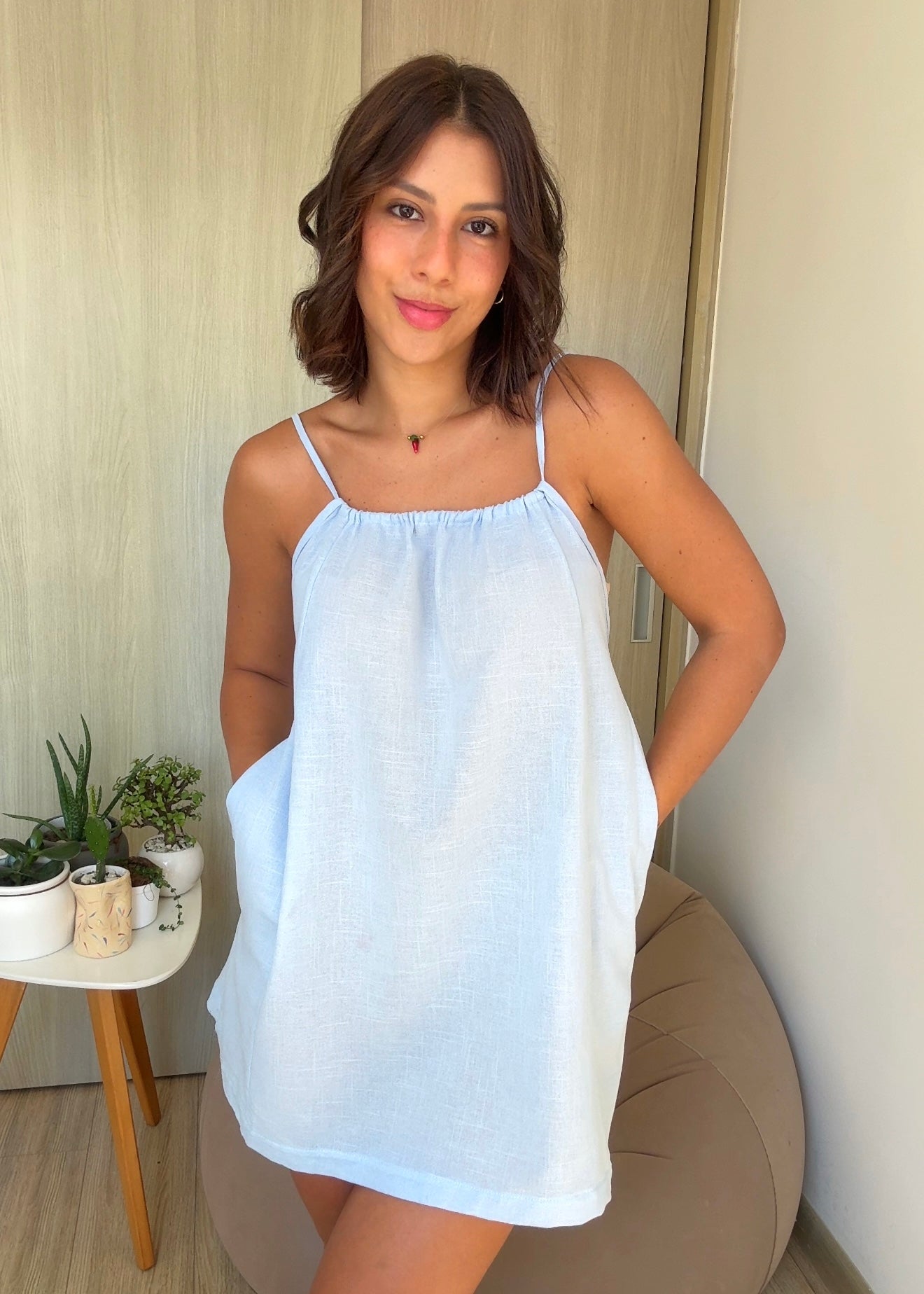 Vestido confeccionado en lino, con tiras ajustables y prácticos bolsillos para mayor comodidad